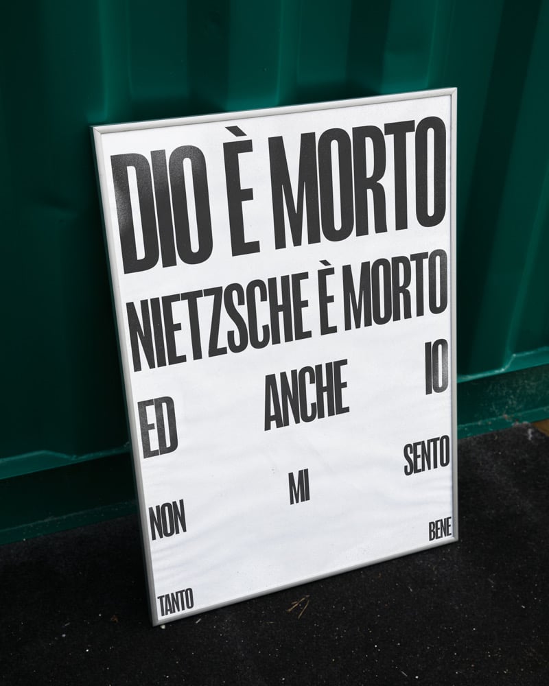 Appeso al muro, questo poster è un sorriso amaro contro ogni speranza metafisica: se Dio è morto e anche i suoi critici sono spariti, resta solo un’autoironia stanca ma lucida, perfetta per chi non crede più a nessuna promessa, terrestre o celeste.